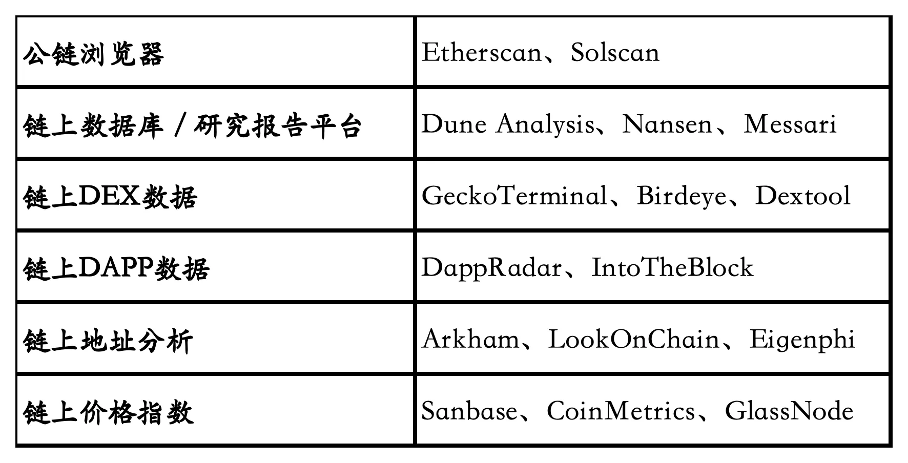 公开数据主要分为链上数据(公链交易数据、去中心化应用的交易数据)、交易所和矿池的价格信息(如 Binance、Huobi、Bybit、CoinMarketCap、CoinGecko、Trading View、CoinAnk)、媒体数据(如 Twitter、Discord、CoinDesk、Foresight News)、研究报告(如 Messari、Tokeninsight)等。